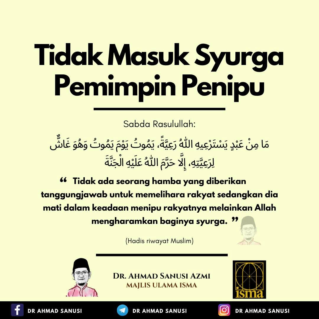 Maksudnya: Tidak ada seorang hamba yang diberikan tanggungjawab untuk memelihara rakyat sedangkan dia mati dalam keadaan menipu rakyatnya melainkan Allah mengharamkan baginya syurga. (Sahih Muslim, no: 142)